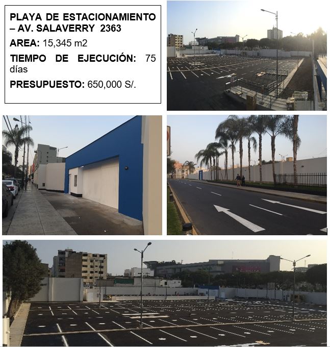 Construcción de playa de estacionamiento llave en mano incluyo obras civiles, asfalto, instalaciones eléctricas, instalación de transformador, instalaciones sanitarias, acabados. AREA: 15,345 m2. TIEMPO DE EJECUCIÓN: 75 días. PRESUPUESTO: S/ 650,000