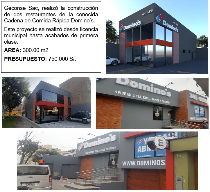 Geconse Sac, realizó la construcción de dos restaurantes de la conocida Cadena de Comida Rápida Domino’s. Este proyecto se realizó desde licencia municipal hasta acabados de primera clase.