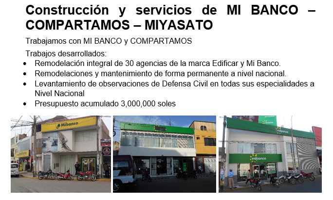 Remodelación integral de 30 agencias de la marca Edificar y Mi Banco. Remodelaciones y mantenimiento de forma permanente a nivel nacional. Levantamiento de observaciones de Defensa Civil en todas sus especialidades a Nivel Nacional. Presupuesto acumulado 3,000,000 soles