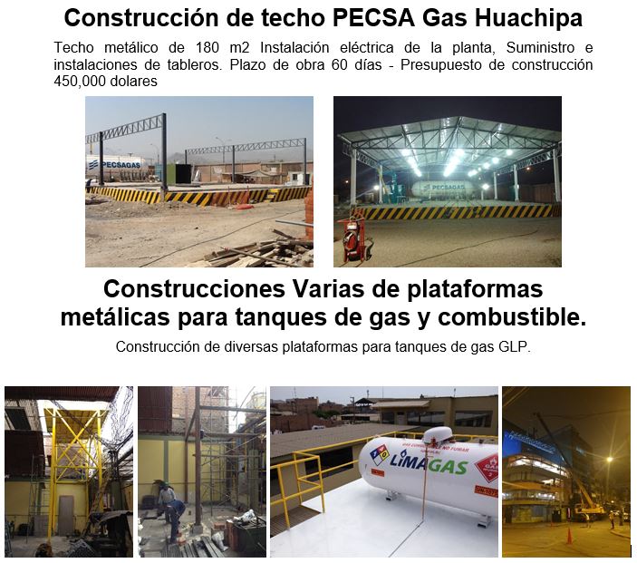 Construcción de techo PECSA Gas Huachipa. Techo metálico de 180 m2 Instalación eléctrica de la planta, Suministro e instalaciones de tableros. Plazo de obra 60 días - Presupuesto de construcción 450,000 dolares