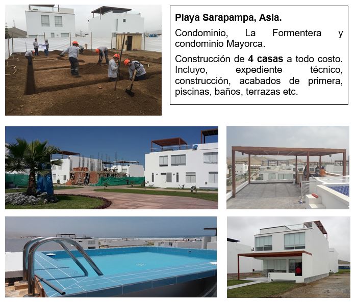 Playa Sarapampa, Asia. Condominio, La Formentera y condominio Mayorca. Construcción de 4 casas a todo costo. Incluyo, expediente técnico, construcción, acabados de primera, piscinas, baños, terrazas etc. PRESUPUESTO: 1,650,000 $